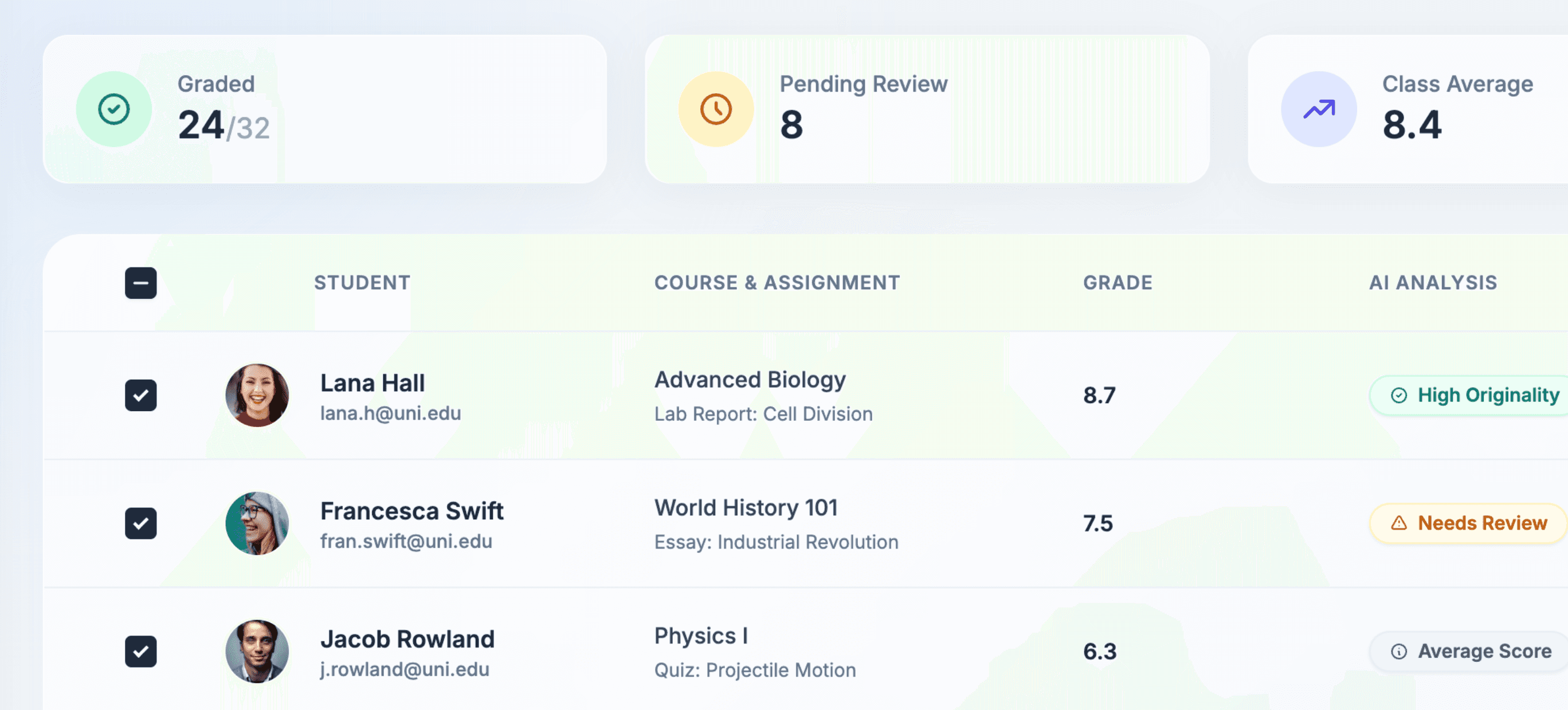 Use AI to correct exams and assignments with rich, personalised feedback for every learner—while teachers keep full control of rubrics, final marks and edge cases.