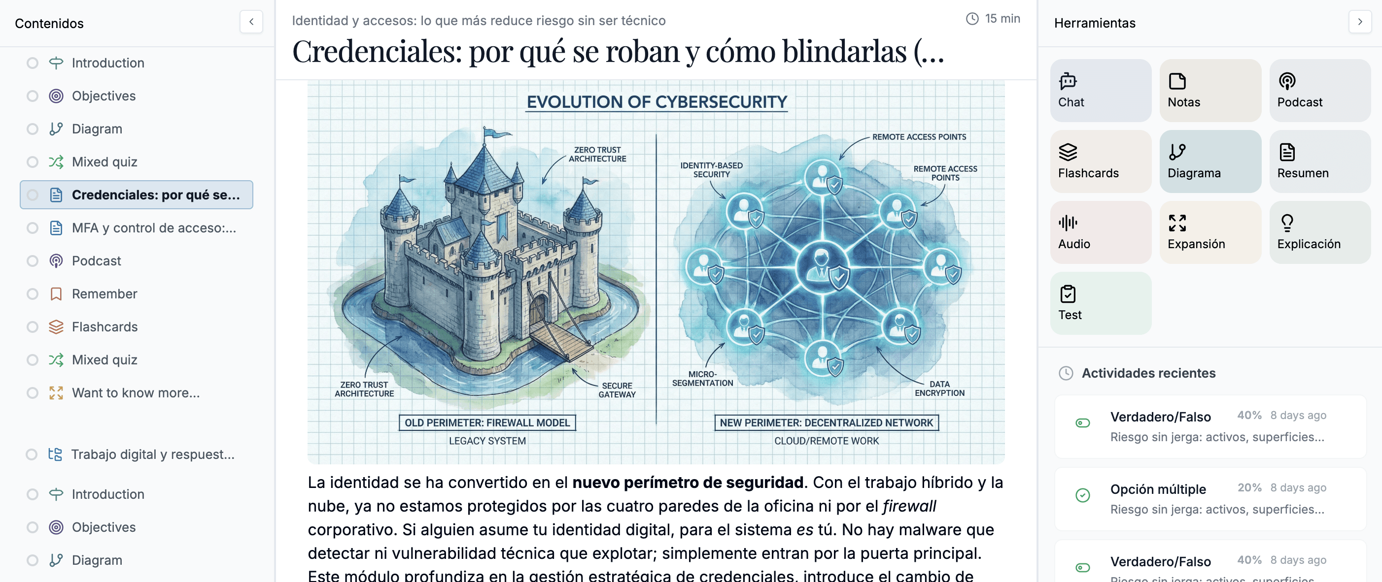 Give each student or employee a notebook-like workspace built from your own content. Study brings together lessons, practice and an AI copilot, with clear progress data to keep learners on track.